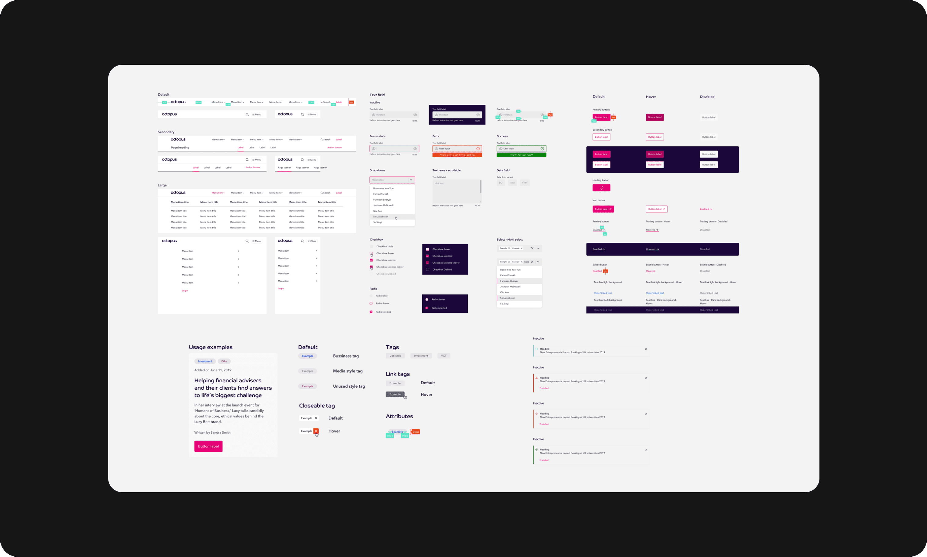 We built the system from atoms through to full pages, defining typography, colour, and grid foundations before scaling into navigation, forms, calls to action, and tags. Cards became a core focus and were designed as a single flexible component made from shared atoms.